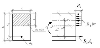Рис. 27. Прямоугольное сечение с одиночной арматурой и схема усилий.