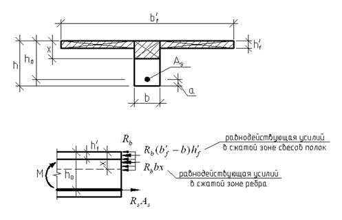 Рис. 34. К расчету растянутой арматуры в элементах таврового профиля. Условие прочности по сжатой зоне:
