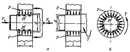 где Fa – продольная осевая сила действующая в соединении, стремящаяся сдвинуть одну деталь относительно другой, Н; f – коэффициент трения при установившемся процессе распрессовки или проворачивания; d и l – диаметр и длина контакта посадочных поверхностей, м; S – коэффициент запаса сцепления. При нагружении соединения вращающим моментом Т (рис.1.14. б), потребное давление для его передачи рассчитываем по формуле (1.39):