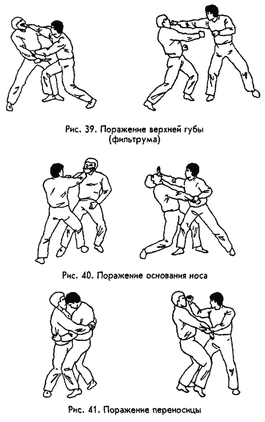 12. ПОДРЕБЕРЬЕ Так называется участок тела ниже ложных ребер. Удар в эту область, направленный по прямой линии от правого или левого бока внутрь тела, вызывает интенсивные болевые ощущения и внутреннее кровотечение. Это связано с тем, что в прилегающих к бокам районах брюшной полости проходят крупные кровеносные сосуды, находятся многочисленные нервные узлы. Если же удар направлен снизу‑ вверх, как бы под ребра, то он травмирует либо печень (и расположенный под ней желчный пузырь), либо селезенку. Такой удар, кроме того, легко ломает десятое ребро (рис. 36). Разумеется, для того чтобы удар в подреберье был проникающим внутрь тела, надо производить его небольшой ударной поверхностью — носком обуви, кулаком «лапа дьявола», клювом из сжатых вместе пальцев. А еще лучше — концом палки. Вверх же хорошо бить коленом, основанием и ребром ладони, кулаком. Дело облегчается тем, что у большинства нынешних городских жителей мышцы боковых поверхностей торса развиты слабо. Они не косят траву, не пилят дрова, не копают землю — откуда взяться сильным боковым мышцам? 13. КЛЮЧИЦА Даже от слабого удара по ключице человек испытывает острую боль, а для того, чтобы ее сломать, требуется усилие всего‑ навсего в 25 килограмм на один квадратный сантиметр. Такое усилие доступно и подростку, и нетренированной женщине. Направление удара — сверху‑ вниз, оружие тела — ребро или основание ладони, нижняя часть кулака, голова, иногда локоть (рис. 37). Важно, что со сломанной ключицей человек не может сильно бить и другой рукой и даже ногами. При более сильных ударах ключица не просто ломается, а полностью разрушается и травмирует своими осколками верхушки легких, бронхи, крупные кровеносные сосуды. 14. БОКОВАЯ ПОВЕРХНОСТЬ ШЕИ В этом месте проходят сонная артерия, яремная вена и блуждающий нерв. В результате даже слабого удара ребром или основанием ладони, кулаком, локтем, у человека падает кровяное давление, затрудняется дыхание, нарушается ориентация в пространстве. Но главное то, что он ощущает острую боль. При более сильном воздействии происходит потеря сознания (хотя для жизни удары такого рода не опасны), или же, как минимум, человек падает на землю (рис. 38). 15. ВЕРХНЯЯ ГУБА («ФИЛЬТРУМ», ИЛИ НОСОГУБНАЯ СКЛАДКА) Если быть точным, имеется в виду участок лица между основанием носа и верхней губой. Его считают одним из самых уязвимых мест человека. Здесь носовой хрящ срастается с черепной костью и находится нервный узел (рис. 39). Даже от слабого удара ребром ладони, «вилкой», или кулаком, направленного вглубь лица, ваш противник ощутит острую боль. Если же ударить посильнее, то наступит болевой шок, сотрясение мозга, потеря сознания и, не исключено, смерть. Все зависит от силы удара, его траектории и точности попадания. В любом случае хлынет кровь, не из носа, так из верхней губы. 16. ОСНОВАНИЕ НОСА Удары сюда лучше всего производить «вилкой» между большим и остальными пальцами, кулаком «лапа дьявола» (т.е. вторыми фалангами согнутых пальцев) либо основанием ладони. Нос — орган весьма чувствительный, поэтому достаточно короткого тычка, чтобы любой «качок» запрокинул голову назад, а из ноздрей у него пошла кровь. Удар в основание носа не требует никакой силы, однако и «вырубить» им крепкого мужчину вряд ли возможно. Его следует использовать в качестве средства, заставляющего про