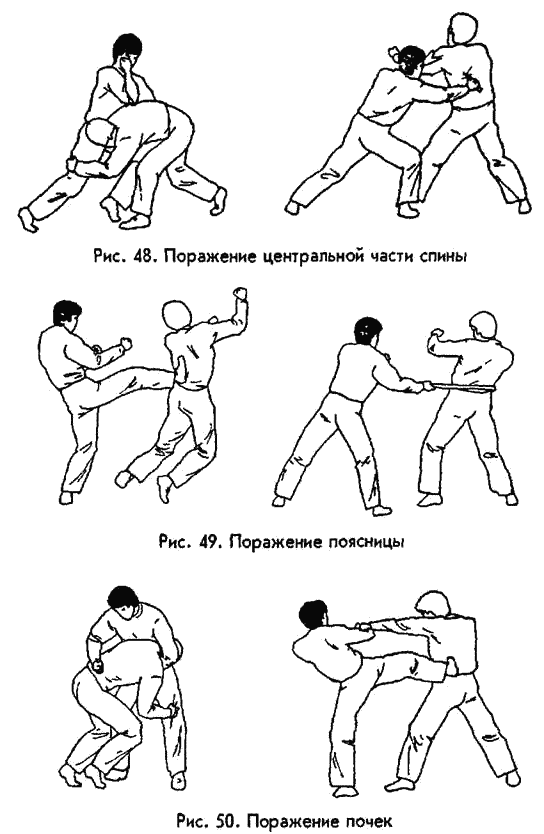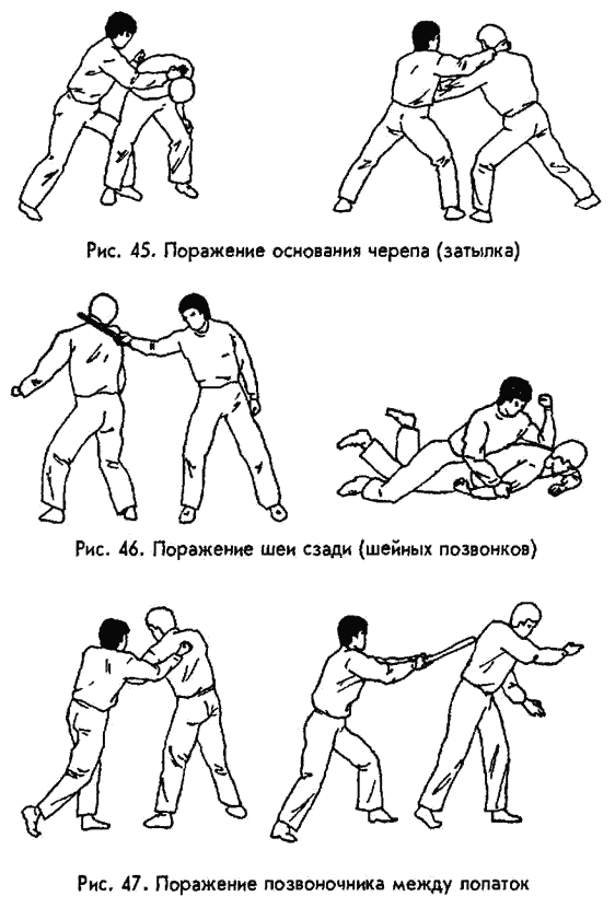 Дело в том, что височная кость черепа очень тонкая, а непосредственно под ней проходит мозговая артерия. В висок обычно бьют кулаком (точнее, костяшкой указательного пальца), основанием кулака, фалангой согнутого большого пальца и иногда локтем, если противник невысок. 20. УХО Это орган не только слуха, но и равновесия (полукружные каналы внутреннего уха). Наиболее эффективен одновременный удар по ушам ладонями обеих рук, согнутыми наподобие чашек. В результате человек ощущает болевой шок, головокружение, его тошнит, он теряет ориентацию в пространстве. При более сильном воздействии могут лопнуть барабанные перепонки, возможно также внутреннее кровоизлияние в мозг со смертельным исходом (рис. 44). В ухо бьют и ребром ладони, костяшками кулака, его основанием, локтем. Барабанную перепонку нетрудно пробить большим пальцем, с силой вогнав его в отверстие слуховой раковины, что влечет за собой дикую боль. 21. ЗАТЫЛОК (ОСНОВАНИЕ ЧЕРЕПА) Это то место, где шея соединяется с черепом. Удар ребром ладони, ее основанием, кулаком, локтем по этому месту сопровождается острой болью, потерей ориентации, полуобморочным состоянием — если он относительно слаб, более мощный удар смещает шейные позвонки, ущемляет или разрывает спинной мозг, в результате чего человек оказывается в реанимации, а то и на кладбище (рис. 45). В том и другом случае противник мгновенно выходит из строя на длительное время. Только вот хорошо приложиться к вражескому затылку, особенно если враг этот высок ростом и крепок сложением, очень и очень непросто. 22. ШЕЯ СЗАДИ Как известно, позвоночник человека состоит из 7 шейных, 12 грудных, 5 поясничных позвонков, а также из крестца и копчика, образованных сросшимися позвонками. Внутри позвонков проходит нервный ствол спинного мозга. Травмы позвоночника, связанные со смещением или переломом позвонков, сопровождаются тяжелыми повреждениями (частичными либо полными разрывами) спинного мозга. Разрыв его шейных отделов полностью парализует человека. Разрывы в грудном отделе парализуют мышцы живота и межреберные, что крайне затрудняет дыхание, а в поясничном отделе — паралич нижних конечностей (рис. 46). Любые удары по позвоночнику ребром и основанием ладони, кулаком, а тем более таким мощным оружием как голова, локоть, колено, ступня чрезвычайно болезненны и очень опасны. При слабом ударе человек ощущает острую боль, на короткое время лишающую его способности к продолжению боя. Сильный удар валит его на землю и полностью выводит из строя, возможен также смертельный исход. 23, 24, 25. ЛОЖБИНА МЕЖДУ ЛОПАТКАМИ, ПОЯСНИЦА И ЦЕНТРАЛЬНАЯ ЧАСТЬ СПИНЫ Тремя основными мишенями на спине являются следующие: ложбина между лопатками, центральная часть спины и поясница (рис. 47, 48, 49). Как уже сказано выше, удары в любую часть позвоночника очень болезненны и опасны. Иногда указывают еще и копчик как уязвимое место пониже спины, однако любой врач‑ травматолог скажет вам, что это далеко не так. Удар по копчику должен быть сильным и направляться исключительно снизу вверх, чтобы человек ощутил острую боль. Но даже если удастся его сломать, это не помешает противнику драться, страдать от боли он будет потом. 26. ПОЧКА Почка — крупный внутренний орган, его длина у взрослого человека составляет 10‑ 13 см, а ширина 5‑ 6 см, причем левая почка длиннее и толще, чем правая. Почк