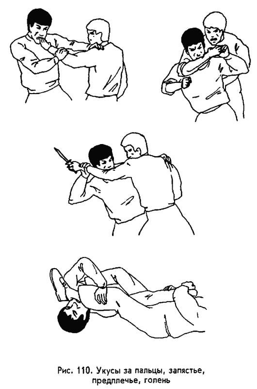 Когда смотришь по видео очередной боевик, часто возникает чувство внутреннего протеста. По крайней мере, у людей вроде меня. В самом деле, какой‑ нибудь маньяк‑ извращенец навалился сверху на взрослого мужика и душит его руками за горло. Или обхватил за корпус с руками сзади и бьет головой о стену. А тот беспомощно трепыхается, хотя даже ребенок мог бы догадаться, что надо делать: откусить нос, выколоть пальцем глаз, перегрызть сухожилие на руке, открутить яйца, вырвать дыхательное горло… Руки‑ то ведь у жертвы свободны, если не вверху, так внизу! Я понимаю, что режиссеры фильмов подобного рода не могут идти по пути реализма. В противном случае большинство боевиков должно было бы заканчиваться минут через 15‑ 20 после начала. Но вам, равно как и мне, пренебрежение жизненными реалиями может обойтись слишком дорого. Поэтому следует уделять определенное время тренировке приемов захвата. Должен лишь пояснить, что представленные здесь 25 их разновидностей представляют собой обязательный минимум такой техники. Выучите хотя бы его. Никто вам не запрещает в дальнейшем освоить еще 125 или 250 приемов, основанных на захватах. УКУСЫ. Кусать, в принципе, можно за любую часть тела, в том числе за ту, что прикрыта одеждой. Все зависит от того, насколько у вас крепкие и острые зубы, какова сила сжатия челюстей. Впрочем даже если часть зубов заменена протезами, лучше потерять их, чем здоровье или жизнь. Все же проще кусать те участки, которые оголены, либо ограждены от внешней среды чем‑ нибудь тонким, скажем, рукавом сорочки, майкой или носком. Да и сами эти участки различаются между собой по силе болевых ощущений, возникающих от укусов. Исходя из сказанного, рекомендую две основные зоны атаки для ваших зубов — руки и голову с шеей. Вверху можно выделить три главные цели: уши, нос, боковую часть шеи (рис. 109), на руках — две: пальцы и предплечья (рис. 110). Запомните, что кусать надо движением, поворачивающим голову вокруг вертикальной оси (справа налево или слева направо), а не поднимающим ее вверх либо опускающим вниз. Непосредственно перед укусом требуется максимально обнажить зубы путем напряжения и отведения в стороны губ. Иначе вы пораните их о свои же зубы. Кстати, возникающий при обнажении зубов оскал производит удручающее впечатление на психику противника, особенно, если вы одновременно начнете рычать и всем своим видом демонстрировать ненасытную жажду свежей крови.