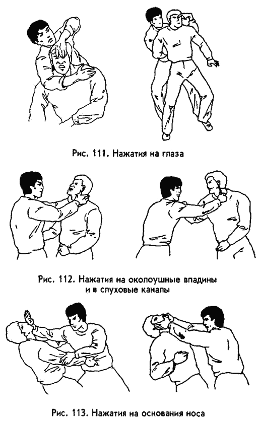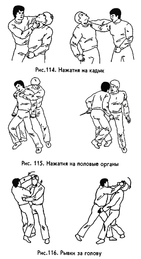 Искусство это достаточно сложное. Чтобы хорошо его освоить, надо разобраться в учении восточной медицины о каналах, по которым циркулирует «внутренняя энергия» и выучить топографию точек, покрывающих тело густой сетью. Еще «необходимо обладать сравнительно большой силой пальцев и отточенной техникой»[15]. Поэтому мы с вами ограничимся здесь самым что ни на есть минимумом таких приемов, доступных любому человеку. В ситуациях боя «в обхват» (на сверхближней дистанции), когда нельзя ударить ни рукой, ни ногой, небольшие по амплитуде движения — защиты и нажатия пальцами — могут оказаться единственным нашим оружием. Запомните следующие цели: глаза, нос, кадык, уши, половые органы. Даже легким надавливанием на любую из них можно вызвать ноющую боль, лишить противника возможности активно действовать. В отличие от ударов, силу нажатий легко контролировать, поэтому можно обойтись без причинения тяжких повреждений врагу, если в том нет нужды. Что касается глаз (рис. 111) и половых органов (рис. 115), здесь особых пояснений не требуется. Нос лучше всего атаковать давящим движением больших пальцев (или «вилкой» между большим пальцем и указательным) в направлении снизу‑ вверх (рис. 113). При резком нажатии противник обязательно запрокинет голову назад, и тогда откроется возможность той же рукой ущемить ему кадык (щитовидный хрящ, выступающий на горле у мужчин; китайцы называют эту цель точкой «ляньцюансюэ»). Ущемление производится большим пальцем и основанием указательного справа и слева к центру. Для усиления болевого воздействия можно сочетать ущемление хряща со скручиванием (рис. 114). Уши можно атаковать по‑ разному. Во‑ первых, воткнуть в ушной канал твердый узкий предмет (шариковую ручку, карандаш, древесную веточку, щепку) и пробить им барабанную перепонку (рис. 112, б). Во‑ вторых, если у вас сильные пальцы, можно просто откручивать ухо, что вызывает ощутимую боль, заставляет противника отвлечься и, следовательно, потерять инициативу Но лучше всего использовать третий вариант: давить пальцами на околоушные впадины (точки «тяньжунсюэ»), находящиеся между мочками ушей и верхними отростками грудино‑ ключично‑ сосцевидных мышц. В результате противник обмякнет у вас под руками либо потеряет сознание (рис. 112, а). Кроме перечисленных, китайские мастера выделяют в качестве общедоступных целей еще точки на висках, затылке, шее, запястьях, однако я не разделяю их мнение о том, что данные цели легко поразить неопытному человеку. РЫВКИ. Это такие действия, когда человек, захватив одежду, кожу, волосы, конечность противника, его голову или половые органы, изо всех сил и как можно резче дергает их на себя либо в сторону. В результате противник испытывает сильную боль, теряет инициативу и вдобавок может получить серьезнейшую травму. Например, рывком за руку удается выдернуть ее из плечевого сустава; рывком за кадык — вырвать дыхательное горло (что, кстати, вполне по силам даже обычной женщине, не занимающейся армреслингом); рывком за голову — сломать шейные позвонки… Остается лишь перечислить те места, рывковое воздействие на которые не требует особой силы. Это волосы на голове (а также усы и борода, если они есть), кадык, сама голова в целом, пальцы на руках, половые органы.