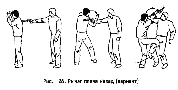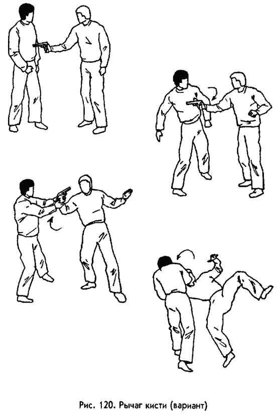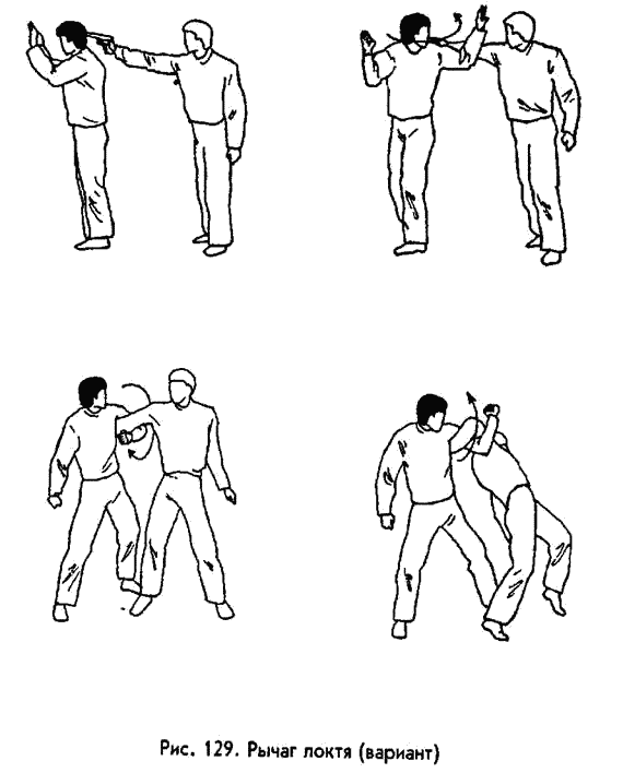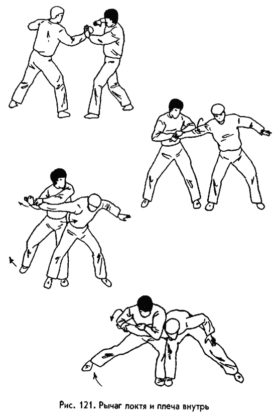 О голове следует сказать несколько слов отдельно. Итак, ее надо скручивать влево или вправо резким встречным движением обеих рук: одна рука толкает голову в верхнюю часть, другая — тянет за нижнюю челюсть (рис. 116). У большинства людей мышцы шеи развиты слабо (спортсмены‑ борцы не в счет), к тому же рывок надо производить неожиданно, пользуясь тем, что шейные мышцы не напряжены. Если момент для рывка выбран удачно, то шейные позвонки ломаются без особого труда. Но учтите, что данная травма всегда влечет за собой мучительную смерть! РЫЧАГИ. Это болевые приемы на суставы конечностей, заключающиеся в их выкручивании. Они требуют определенной силы рук, но в большей мере, чем сила, нужны быстрота действий и ловкость. Для практического применения в ситуациях «средней экстремальности» вам вполне хватит пяти подобных приемов: четырех на руки и одного на ноги. Это рычаг кисти и локтя наружу; локтя и плеча внутрь, локтя и плеча вверх, локтя и плеча через предплечье и, наконец, рычаг голеностопного сустава. Все они показаны на рисунках (рис. 118—130). Думаю, что нет смысла описывать технику проведения данных приемов, так как иллюстрации достаточно информативны. К тому же указанные приемы подробно описаны в многочисленных пособиях по самбо, дзюдо, рукопашному бою. БРОСКИ. Так называют приемы выведения из равновесия, заканчивающиеся падением противника на землю. Сделать это можно разными способами, в том числе и рычагами. Но рычаги всегда проводят руками, без подключения ног. Здесь же мы рассмотрим броски с помощью ног и корпуса. Они тоже бывают разных видов. В одних главную роль играет сила мышц, например, в броске через бедро или в броске через себя наклоном вперед. Нам они не подходят, так как бросить подобным образом массивного противника неопытный человек не в состоянии. Известны также броски, построенные на использовании инерции тела того, кто атакует. Именно они являются технической базой айкидо. Но броски айкидо требуют высокого уровня подготовки обороняющегося по этой системе и, кроме того, довольно много места для проведения. И, наконец, существует группа бросков, суть которых — в приложении мышечных усилий рук, ног и корпуса навстречу друг другу. Благодаря этой особенности, здесь не требуется особой силы. Как и в случае с рычагами, гораздо важнее удачный выбор момента, быстрота и ловкость.