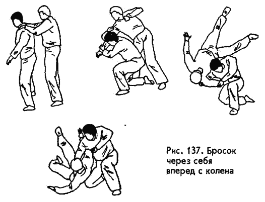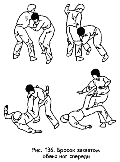 Изучите хотя бы пять таких бросков: задней подножкой (вариант — подбивом сзади); подсечкой сбоку; зацепом (изнутри либо снаружи); захватом обеих ног спереди (можно также захватом ног сзади); через себя (если вперед, то опускаясь на одно колено, если назад, то в падении на спину) (рис. 131‑ 138). Проводя броски, желательно не забывать о трех вещах. Во‑ первых, бросать противника надо опасно для него, бросать так, чтобы он наверняка получил травму. Это значит, удерживать его руку для обеспечения перелома; наоборот, не удерживать противника ни за одну часть тела (смотря какой вид броска вы используете); бросать с «оттягом» или на голову; бросать на твердые предметы (на ограду, угол дома, на камни, ящики, мебель и т.д.). Во‑ вторых, если вы падаете вместе с противником, старайтесь всегда оказаться сверху или сбоку от него, ни в коем случае снизу. В‑ третьих, всегда производите добивающий удар по упавшему в результате броска противнику. Например, локтем, ступней, головой ему в лицо, в солнечное сплетение, по половым органам. Надо гарантировать выведение его из строя не менее, чем на несколько минут, а одного броска для этого часто оказывается недостаточно.