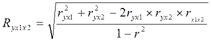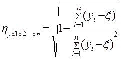 yi – фактичні значення досліджуваного показника; Коефіцієнт множинної кореляції відображає сукупний вплив декількох чинників на зміни результативної ознаки. Значення його може бути від нуля до одиниці із знаком мінус або плюс: -1< =R< =1; якщо R=0 - зв'язок відсутній, якщо R=1 – зв'язок функціональний. Для двох чинників: