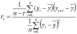 де r2– коефіцієнт детермінації. Коефіцієнт детермінації показує, якою мірою зміна модельованої ознаки залежить від зміни даного чинника. Різниця (1-r^2) –зміна ролі варіації, обумовленої впливом інших чинників. Інколи ці характеристики виражаються у відсотках. ТЕМА 7. ПОБУДОВА ЄКОНОМЕТРИЧНОЇ МОДЕЛІ З АВТОКОРЕЛЬОВАНИМИ ЗАЛИШКАМИ 7.1 Автокореляціїни функції 7.2 Основні стадії економетричного моделювання величини будівельного заділу. 7.1 Автокореляціїни функції При статистичному аналізі тимчасових рядів часто виникає необхідність, окрім визначення основних характеристик ряду, оцінити залежність показника уt, що вивчається, від його значень, що розглядаються з деяким запізнюванням в часі. Залежність значень рівнів тимчасового ряду від попередніх (зрушення на 1), попередніх (зрушення на 2) і так далі рівнів того ж тимчасового ряду називається автокореляцією в тимчасовому ряду. Для здобуття числової характеристики такої внутрішньої залежності обчислюють взаємну кореляційну функцію між вихідним рядом уt і цим же рядом, зрушеним в часі на величину r Задаючи різні значення Графік автокореляційної функції називається корелограмою і показує величину запізнювання, з яким зміна показника уt позначається на його подальших значеннях. Величина зрушення, якому відповідає найбільший коефіцієнт автокореляції, називається тимчасовим лагом. У ряді випадків використовується спрощена формула для обчислення коефіцієнта автокореляції: