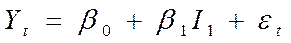 Четверта бінарна змінна, яка відноситься до осені, не вводиться, інакше тоді виконувалася б тотожність: d1+d2+d3+d4=1, Що означало б лінійний зв'язок, залежність між змінними. В цьому випадку коефіцієнти не розраховуються. Таким чином, середньо-місячний об'єм вжитку є b0 для осені, b0 + b1 – для зими, b0 + b2 – для весни, b0 + b3 – для літа. Оцінки коефіцієнтів b1, i=1, 2, 3, показують середні відхилення в об'ємі вжитку по відношенню до осені. Приклад 2. Модель вжитку модифікується введенням нової незалежної змінної – I - дохід, використовуваний на вжиток.