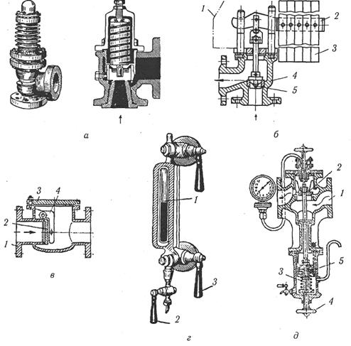 Рис. 3.1. Контрольно-вимірювальні прилади та запобіжні пристрої: а — пружинні запобіжні клапани; б — важільно-вантажний запобіжний клапан: 1 — кожух; 2 — важіль; 3 — вантаж; 4 — сідло; 5 — золотник; в — поворотний зворотний клапан: 1 — корпус; 2 — засув; 3 — кришка; 4 — серга; г — покажчик рівня води: / — скло; 2 — ручка спускного крана; 3 — ручка запірного крана; д — редукційний клапан: / — канал; 2 — золотник; 3 — пружина; 4 — маховичок; 5 — поршень 5. Експлуатація парових і водогрійних котлів. Наявність високого тиску і температури води та пари у водогрійних і парових котлах створюють підвищену небезпеку при їх експлуатації. ДНАОП 0.00-1.08-94 «Правила будови і безпечної експлуатації парових і водогрійних котлів» встановлює вимоги до проектування, будови, виготовлення, монтажу, ремонту і експлуатації парових котлів, автономних пароперегрірачів і економайзерів з робочим тиском більше 0, 07 МПа (0, 07 кгс/см2), водогрійних котлів і автономних економайзерів з температурою води вище 115 оC. Дані Правила не поширюються на котли з електричним обігрівом, котли з об'ємом парового і водяного простору 0, 01 м3 (10 л) і менше, у яких добуток робочого тиску в МПа (кгс/см2) на об'єм в м3 (л) не перевищує 0, 02 (200), пароперегрівачі трубних печей підприємств хімічної, нафтопереробної і нафтохімічної промисловості та деякі інші. Котли до пуску в роботу повинні бути зареєстровані в органах Держнагляд-охоронпраці. Такої реєстрації не підлягають котли, у яких