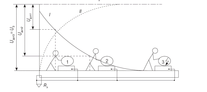 Рис.6.1. Напруга дотику до заземлених не струмопровідних частин, які виявилися під напругою: І – криварозподілу потенціалів 1, 2, 3 – електродвигуни ІІ – крива розподілу напруги дотику