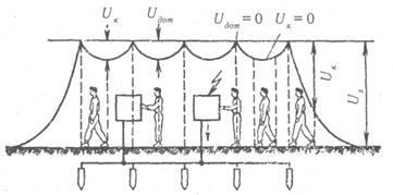 Ноги людини – у точці А, і потенціал ніг φ н становитиме: φ н=UА= Iз ρ /2 π х, (6.3)