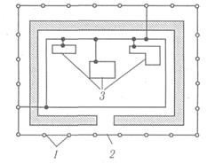 а б Рис. 7.6. Виносне (а) та контурне (б) заземлення: 1 — заземлювачі; 2 — заземлювальні провідники; 3 — устаткування