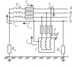 При пошкодженні ізоляції та переході напруги фази на корпус установки 1 спочатку проявляється захисна властивість заземлення, завдяки якій напруга на корпусі знижується до деякої величини Uкор = ІзRз. Якщо значення Uкор буде вищим за гранично допустиму напругу Uкор.доп., то спрацює пристрій захисного вимикання: реле максимальної напруги Н, замкнувши контакти, подає живлення на котушку вимкнення KB, яка розмикає контакти автоматичного вимикача 2, при цьому установка від'єднується від електромережі.