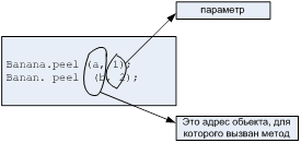 Метод peel() для всех объектов класса Banana один. Как метод peel() узнает, для кого он вызывается: a и b? А происходит следующее: передается скрытый аргумент – ссылка на объект, для которого вызван метод.