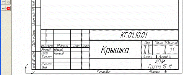 Рис.3 Заполнение основной надписи Шифр чертежа включает в себя следующие разделы: КГ – название дисциплины; 01 – порядковый номер лабораторной работы; 10 – индивидуальный номер варианта выполняемой работы; 01 – порядковый номер чертежа.
