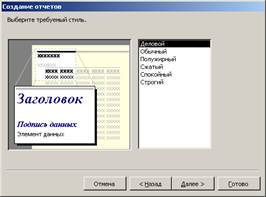 У наступному діалоговому вікні вибирається стиль звіту (мал. 26.11). Вибраний стиль відображується у вікні попереднього перегляду в лівої зони вікна. У останньому діалоговому вікні вам пропонується задати ім'я звіту. Залежно від положення перемикача ви можете Проглянути звіт або Змінити макет звіту. За умовчанням після натиснення кнопки Готово майстер відображуватиме звіт у вікні попереднього перегляду.
