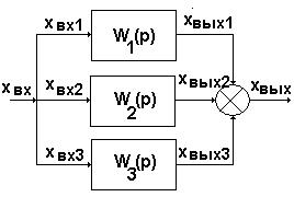Для данного рисунка xвх1(p)=хвх2(p)=хвх3(p)=хвх(p) xвых(p)=хвых1(p)+хвых2(p)+хвых3(p) Для каждого звена можем записать:
