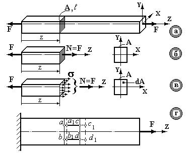 Вирішити це рівняння неможливо, тому що невідома величина та закон розподілу по перерізу напруження s. Щоб описати закон розподілу напружень s за поперечним перерізом, звернемося до фізичного експерименту. Як показують експерименти, при центральному розтяганні-стисканні однакові подовжні відрізки ас і bd стержня одержують однакові подовження (рис.2.3г): (a 1 c 1 – ac) = (b 1 d 1 – bd). Лінії на бічній поверхні стержня, що представляють сліди поперечних перерізів, рівнобіжні до деформування, залишаються рівнобіжними й у процесі деформування: ab || a 1 b 1 і cd || c 1 d 1.