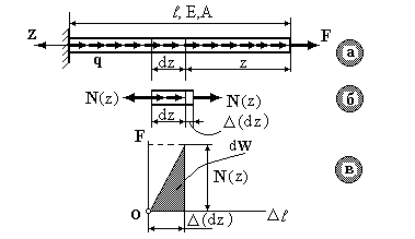 Потенційна енергія пружної деформації. Потенційна енергія деформації, накопичена у пружному тілі, чисельно дорівнює роботі зовнішніх сил, виконаної в процесі деформування пружного тіла, тобто U = W. Розглянемо елемент довжиною dz, навантажений статично (рис.2.5а). У межах нескінченно малого елемента значення поздовжньої сили N(z) у крайніх перерізах елемента dz однакові (рис.2.5.б). Елементарна робота зовнішніх сил чисельно дорівнює площі заштрихованого трикутника, тобто