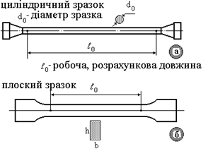 Необхідність знання якісних та кількісних характеристик механічних властивостей матеріалів припускається наступним. 1. Для побудови розрахункової теорії необхідно мати вихідні експериментальні дані, на основі яких можна побудувати теорію – це закон Гука. Основними характеристиками матеріалу при цьому є модуль пружності Е та коефіцієнт Пуассона m. 2. Для рішення практичних задач і виконання інженерних розрахунків вимагаються числові характеристики міцності та пластичності матеріалів. Для цього проводять випробування стандартних зразків з матеріалів на розтягання, стискання, руйнування, кручення, згинання, загин, визначення ударної в'язкості, визначення твердості, на витривалість та ін. Випробування на розтягання. Основним видом механічних випробувань є випробування на розтягання, тому що при цьому найбільш яскраво виявляються механічні властивості матеріалу. Саме при цьому випробуванні вдається одержати найбільш важливі характеристики матеріалів для розрахункової практики. Для випробування на розтягання використовують стандартні циліндричні зразки (рис.4.1а), що мають задане співвідношення розмірів (діаметра d0 та робочої довжини