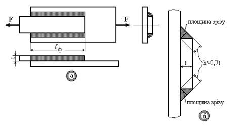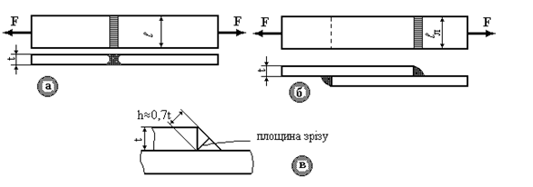 Рис.9.8. Зварений шов при з'єднанні у стик (рис.9.8а) працює на розтягання чи стискання. Умова міцності шва: Тут