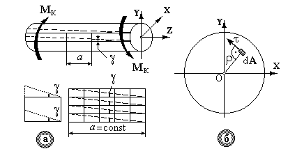 Рис.10.3. 1.При крученні поперечні перерізи стержня повертаються навколо його осі і відносно один одного. 2.Утворюючі повертаються на один і той же кут g. Квадрати перетворюються в ромби, прямі кути змінюються, як і у випадку чистого зсуву (рис.10.3а). Це свідчить про те, що виділений елементарний обсяг будь-якого шару вала знаходиться в умовах чистого зсуву. 3. Поперечні лінії після деформації не скривлюються, тобто при крученні стержня круглого перерізу дотримується гіпотеза плоских перерізів: переріз плоский і нормальний до осі до деформації залишається плоским і нормальним до осі в процесі деформації. 4.Відстані між перерізами в процесі деформації не змінюються (a = const), це підтверджує відсутність у перерізі нормальних напружень. 5.Довжина і прямолінійність радіусів перерізів не порушується, тобто дотичні напруження t у будь-якій точці перерізу перпендикулярні радіусу r (рис.10.3б). Розглянемо стержень діаметром d, довжиною