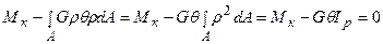 З останніх рівнянь випливає, що статичні моменти Sx, Sy площі перерізу щодо осей x, y дорівнюють нулю, оскільки G і q не дорівнюють нулю. Статичні моменти площі тільки відносно центральних осей дорівнюють нулю. Таким чином осі x, y є центральними осями перерізу. Іншими словами, центр кручення («нуль» напружень) збігається з центром ваги перерізу. Підставляючи залежність (10.7) у рівняння (10.3), і з обліком того, що інтеграл
