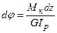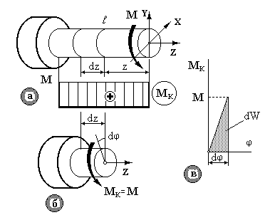 Потенційна енергія деформації U, накопичена в пружному тілі, чисельно дорівнює роботі W зовнішніх сил, виконаної в процесі деформування пружного тіла. Розглянемо стержень довжиною ℓ навантажений крутильним моментом М (рис.10.6а). Виріжемо елементарний відрізок dz і розглянемо його деформацію. Умовно закріпимо лівий переріз нескінченно малого елемента вала dz. При статичному навантаженні моментомMк правий переріз елемента повернеться на кут dj (рис.10.6б). Елементарна робота dW моменту Mк на куті закручування dj при навантаженні визначається площею трикутника (рис.10.6в), тобто