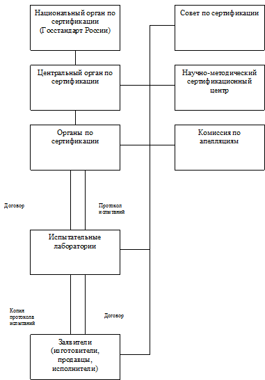 В странах с развитой экономикой и рыночной инфраструктурой преобладает добровольная сертификация, результаты которой используются в качестве рекламы, являются подтверждением конкурентоспособности и качества товара. Например, около 75 % продукции французских фирм проходит через добровольную сертификацию. В России в настоящее время проводится в основном обязательная сертификация. В добровольной сертификации пока заинтересованы в основном экспортеры. Для широкого распространения добровольной сертификации в России необходимо: – наличие систем сертификации для широкого спектра услуг в условиях рыночной экономики; – законодательная поддержка и пропаганда добровольной сертификации; – организационное обеспечение условий прохождения добровольной сертификации; – устоявшаяся культура работы производителей в конкурентной среде; – общественная потребность подтверждения качества продукции. Комитет Российской Федерации по стандартизации, метрологии и сертификации (далее — Госстандарт России) в соответствии с законом: – формирует и реализует государственную политику в области сертификации, устанавливает общие правила и рекомендации по проведению сертификации на территории Российской Федерации и опубликовывает официальную информацию о них; – проводит государственную регистрацию систем сертификации и знаков соответствия, действующих в Российской Федерации; – опубликовывает официальную информацию о действующих в Российской Федерации системах сертификации и знаках соответствия и представляет ее в установленном порядке в международные (региональные) организации по сертификации; – готовит в установленном порядке предложения о присоединении к международным (региональным) системам сертификации, а также может в установленном порядке заключать соглашения с международными (региональными) организациями о взаимном признании результатов сертификации; – представляет в установленном порядке Российскую Федерацию в международных (региональных) организациях по вопросам сертификации как национальный орган Российской Федерации по сертификации. Система сертификации создается государственными органами управления, предприятиями, учреждениями и организациями и представляет собой совокупность участников сертификации, осуществляющих сертификацию по правилам, установленным в этой системе в соответствии с настоящим Законом. В систему сертификации могут входить предприятия, учреждения и организации независимо от форм собственности, а также общественные объединения. В систему сертификации могут входить несколько систем сертификации однородной продукции. Системы сертификации подлежат государственной регистрации в установленном Госстандартом России порядке. Сертификат соответствия (далее – сертификат) – документ, выданный по правилам системы сертификации для подтверждения соответствия сертифицированной продукции установленным требованиям. Знак соответствия – зарегистрированный в установленном порядке знак, которым по правилам, установленным в данной системе сертификации, подтверждается соответствие маркированной им продукции установленным требованиям. Порядок государственной регистрации знаков соответствия устанавливается Госстандартом России. Правила применения знаков соответствия устан