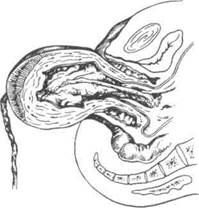 движение его сразу же после преодоления сопротивления зева. Если возникает трудность во введении расширителя Гегара последующего номера, следует вернуться к предыдущему, захватить пулевыми щипцами заднюю губу шейки матки и удержать в шейке некоторое время расширитель. После расширения шейки разрушение и удаление плодного яйца производят с помощью кюреток (рис. 25.3) и абортцанга, если срок беременности не превышает 12 нед. Абортцангом удаляют части плодного яйца из полости матки. Выскабливание стенок матки начинают тупой кюреткой №6 и затем по мере сокращения матки в уменьшения ее размеров используют более острые кюретки меньшего размера. Кюретку осторожно вводят до дна матки и движениями по направлению к внутреннему зеву последовательно по передней. правой, задней и левой стенкам производят отделение плодного яйца от его ложа. Одновременно отделяют в удаляют отпадающую оболочку. Проверив острой кюреткой область трубных углов, заканчивают операцию. При отслойке плодного яйца возникает кровотечение, но кровопотеря обычно не превышает 50—75 мл. Если плодное яйцо удалено полностью, то появляется ощущение хруста, матка хорошо сокращается и кровотечение останавливается. Полноту опорожнения матки от элементов плодного яйца можно контролировать с помощью УЗИ. Инструментальное удаление плодного яйца в сроки 6—12 нед можно производить посредством вакуум-экскохлеа ции. Вакуум-экскохлеацию используют при сроке беременности не более 9—10 нед. Вакуум-экскохлеатор —это система, состоящая из металлической кюретки цилиндрической формы с овальным отверстием на конце, резинового шланга, соединенного с вакуум-отсосом и резервуаром. После расширения канала шейки матки с помощью расширителей Гегара в матку вводят канюлю, включают электро- насос и создают в матке отрицательное давление 0, 5—0, 6 атм. Осторожными круговыми движениями последовательно обходят все стенки матки. В результате плодное яйцо разрушается, отслаивается, аспирируется и через канюлю и шланг поступает в стеклянную банку. Метод вакуум-аспирации является более щадящим, чем удаление яйца кюретками петлевидной формы. После операции женщине на низ живота кладут пузырь со льдом и вводят сокращающие матку средства. Выписка больной после операции искусственного аборта определяется врачом. При выписке из стационара производят влагалищное исследование для определения состояния матки и ее придатков. №67. Аборт в ходу, неполный и полный аборт Аборт в ходу характеризуется тем, что плодное яйцо полностью отслаивается от стенки матки и опускается в ее нижние отделы, в том числе в шеечный канал.Клиника схваткообразные боли внизу живота и выраженное кровотечение. Плодное яйцо находится в канале шейки матки, нижний полюс его может выступать во влагалище. Аборт в ходу может завершиться неполным или полным абортом. При неполном аборте после изгнания плодного яйца в полости матки находятся его остатки. В матке обычно задерживаются плодные оболочки, плацента или ее части.Когда плодное яйцо изгоняется из полости матки, наблюдаются схваткообразные боли внизу живота и кровотечение разной интенсивности. Канал шейки матки свободно пропускает палец. Матка мягковатой консистенции. Величина ее меньше, чем должна быть при предполагаемом сроке беременности.В связи с тем что неполный 