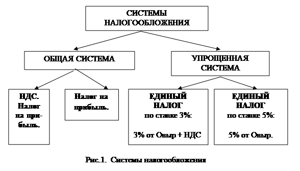 6. НДС. Поскольку в выручке уже содержится НДС, который был уплачен за сырье, полуфабрикаты и пр., т.е. выручка - это 120%, а ставка налога на добавленную стоимость - 20%, то 20: 120 = 0, 167. Таким образом, чтобы сразу выделить сумму НДС из выручки отреализации, нужно выручку умножить на 0, 167. 7. Налог на прибыль исчисляется следующим образом: Нпр = (Овыр - Т3 - НДС) * 0, 25 где: 25 – %-ная ставка налога на прибыль для основной массы предприятий, дол. ед. 8. Ен. Ставка единого налога выбирается по желанию предпринимателя, если его предприятие относится к " малому" и на него распространяются льготы в налогообложении. Критерии, по которым определяется принадлежность предприятия к «малому»: - численность персонала не превышает 50 человек, - объем выручки за год не превышает 500 тыс.грн. При использовании единого налога необходимо помнить, что при ставке 3% от объема выручки - выплачивается еще и сумма НДС, а при ставке 5% - только 5% от объема выручки (см. рис.1). В случае уплаты единого налога налог на прибыль не платится. Если предприниматель не может воспользоваться единым налогом, то он находится на общей системе налогообложения: платит НДС и налог на прибыль. Таким образом в плане денежных потоков (в табл.6) представлено 2 системы налогообложения: общая и упрощенная (для малых предприятий) и 3 варианта их применения: 1). НДС + Нпр; 2). Ен (3%) + НДС; 3). Ен (5%).