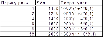 Пример. 1000 грн. положены на банковский счет под 10% годовых. Какова будет стоимость вклада через 1, 2, 4, 6, 8, 10 лет. Расчет выполнен по схеме простых процентов.