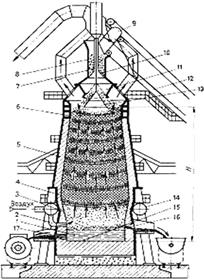Железоуглеродист. наз. сплавы, в кот. основн. компонент. явл. железо и углерод. В зав. от содерж. углерода. подраздел. две группы - чугуны и стали. Чугуном наз. железоуглеродистый сплав, содерж. более 2% углерода, а сталью - сплав, содерж. до 2% углерода.Углерод – важн. примесь стали, так как от кол-ва его зав. прочность, тверд. и пластичн. стали. В состав стали также вход. кремний, марганец, сера и фосфор. Эти примеси обычно попад. в сталь в процессе ее выплавки.Чугун выплавляется в домнах. Печь раб. по принципу противотока. Сверху загруж. руда, флюсы и кокс, а снизу подается воздух. Кокс служит для нагрев. и расплавл. руды, а также участв. в восстановл. железа из окислов руды. В коксе д. б. мин. серы и фосфора. Флюсы (известняки, кремнеземы) необход. для получ. шлаков. При сгорании топлива образ. окись углерода, кот. и явл. гл. восстановителем железа.Чтобы получить сталь из чугуна надо уменьш. в нем кол-во углерода, марганца, серы и фосфора. Сталь получ. в кислородных конверторах, мартеновских печах и электропечах.Мартеновское прои-во менее производительное, чем конверторное, но лучше регулируется процесс, использ. чугунные чушки и металлолом. Мартен это регенеративная пламен. печь.Сталь выс. кач-ва выплавляют в дуговых и индукцион. электропечах. Два периода при выплавке электростали: окислит. (выгорают Si, Mn, C, Fe) за счет кислорода, воздуха и оксидов шихты; восстановит. — раскисление стали, удаление серы. Для этого вводят флюс, состоящий из извести и плавикового шпата.Индукцион. плавка примен. обычно для переплавки сталей и получ. высоколегиров. и спец. сталей в усл. вакуума или спец.регулируемой атмосферы. 33. Устройство и работа доменной печи. Домен. печь имеет стальной кожух, вылож. внутри огнеупорным шамотным кирпичом. Раб. про-во печи включ. колошник 6, шахту 5, распар 4, заплечики 3, горн 1, лещадь 15. В верхн.части колошника наход. засыпной аппарат 8, через кот. в печь загруж. шихту. Шихту взвешивают, подают в вагонетки 9 подъемника, кот. передвиг. по мосту 12 к засыпному аппарату 8 и, опрокидываясь, высып. шихту в приемн. воронку 7 распределителя шихты. При опускании малого конуса 10 засыпного аппарата шихта попад.в чашу 11, а при опускании больш. конуса 13 – в домен. печь, что предотвращ.выход газов из домен. печи в атмосферу. Для равномерн.распредел. шихты в домен. печи малый конус и приемн. воронка после очередной загрузки поворачиваются на угол, кратный 600.При работе печи шихтовые материалы, проплавляясь, опускаются, а через загрузочн. устр-во в печь подаются новые порции шихты в таком кол-ве, чтобы весь полезн. объем печи был заполнен. Полезн. объем печи – это объем, заним. шихтой от лещади до нижн. кромки больш. конуса засыпного аппарата при его опускании. Соврем.е доменные печи имеют полезн. объем 2000 – 5000 м3. Полезн. высота домен. печи достигает 35 м.В верхн. части горна наход. фурменные устр-тва 14, через кот.в печь поступ. нагретый воздух, необход.для горения топлива. Воздух нагрев. для уменьш. потерь теплоты и сниж. расхода кокса. Воздух поступ. в домен. печь из воздухонагревателя, внутри кот. имеется камера сгорания и насадка. Насадка выложена из огнеупорн. кирпичей, так что между ними образ. вертик. каналы. В камеру сгорания к горелке подается очищ. от пыли доменный газ, кот. сгорает и образ. горячие газы. 34. Продукция черн. металлургии: передельн. чугун, литейн. чугун, домен. ферро