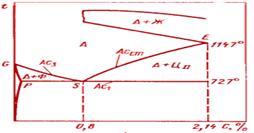 Эвтектоидная сталь (содержание углерода 0, 8% - перлит) при нормальной t° изменяет структуру перлита. При t° 723°С перлит превращается в аустенит. В доэвтектоидных сталях (содержание углерода менее 0, 8% - феррит+перлит), имеющих структуру феррит+перлит, при 727°С перлит превращается в аустенит. При дальнейшем нагревании в интервале температур между линиями PS и GS феррит растворяется в аустените. Выше точки Ас4 будет структура аустенита. У заэвтектоидных сталей (содержание углерода более 0, 8% - перлит+цементит) со структурой перлит +вторичный цементит в т. Ас1 (линия SK) перлит превращается в аустенит. При t°-ах выше линии SK идет процесс растворения цементита в аустените. Он заканчивается при t°-ах, соответствующих точкам, лежащих на линии SE (верхняя критическая точка Асm). Выше линии SE будет однородная структура аустенита. Образующийся при кристаллизации аустенит имеет мелкозернистую структуру. При дальнейшем росте t° начинается рост зерна, что нежелательно. Поэтому нагрев ведут обычно до t° на 30-50° выше критических точек Ас3, Асm или Ас1, и выдерживают при этих t°-ах опр-ное время до завершения превращений в стали. Структурные превращения при охлаждении стали. При охлаждении стали происходит распад аустенита. 1. При t°-ах ниже линии GS выделяется феррит, а ниже линии ES – вторичный цементит. При 727°С оставшийся аустенит превращается в перлит (охлаждение вместе с печью со скоростью ≈ 1° в 1 мин). 2. С увеличением скорости охлаждения имеет место переохлаждения аустенита с образованием распада мелкозернистой ферритно-цементитной смеси. Если охлаждать на воздухе (≈ 1° в 1 с), образуется сорбит. Аустенит переохлаждается до t° 600°С, при этой t° начинается образование сорбита. Оно заканчивается при t° 500°С. Охлаждение в масле увеличивает скорость охлаждения (≈ 50° в 1 с). Аустенит переохлаждается до 500°С, затем образует мелкодисперсную ферритно-цементитную смесь – троостит (500-200°С). При t°-ах, близких к нижнему пределу, образуется игольчатый троостит (бейнит), состоящий из смеси частиц пересыщенного углеродом феррита и цементита. 3. При охлаждении в воде (100-150°С в 1 с) аустенит переохлаждается ≈ до 200°С и сразу превращается в мартенсит – перенасыщенный твердый раствор углерода в альфа-железе. Часть аустенита сохраняется в сталя