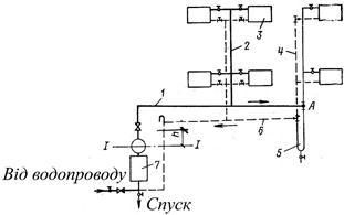 1 – розподільна парова магістраль; 2 – паровий стояк; 3 – нагрівальний прилад; 4 – конденсаційний стояк; 5 – гідравлічний затвор; 6 – збірна конденсаційна магістраль; 7 – котел