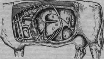 Топография брюшных органов коровы (вид с левой стороны): 1—Г — пищеводный желоб; 2 - отверстие между рубцом и сеткой; 3 — краниальный и 4, 5 — каудальный и дорсальный мешки рубца; 6, 7 — вентральный краниальный мешок; 8— каудальный вентральный мешок рубца; 9, 10, 12, 13, 14— утолщения мышечного слоя, делящего рубец на камеры; 15, 16— борозды стенки рубца; О - сетка; Д — сычуг; В—13-е ребро; //, / 7, 18— камеры рубца.