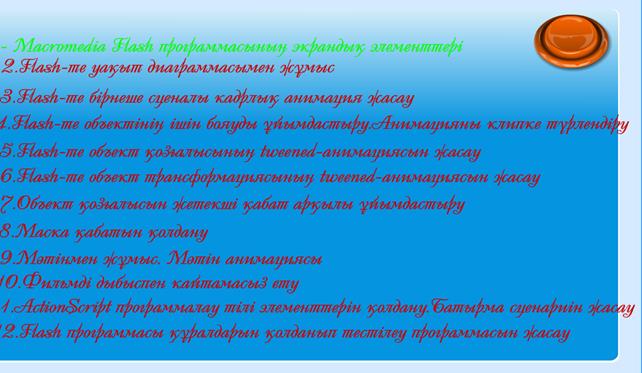 - Батырмасын шерту арқ ылы келесі бетке кө шеміз. Келесі бетте Macromedia Flash бағ дарламасының электронды оқ улығ ының мазмұ ны, зертханалық бө лімі, тест бө лімдерінен тұ ратын 24 суретте кө рсетілген.