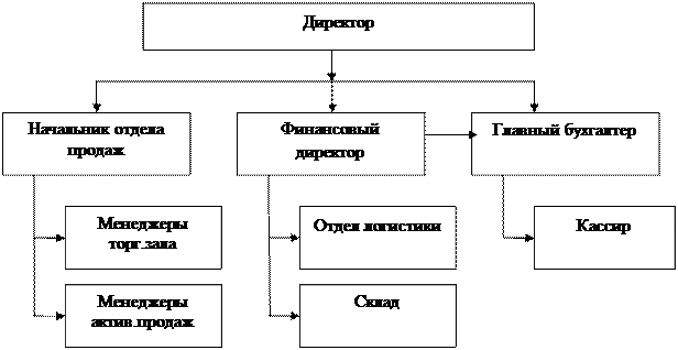 Рис. 2.1 Организационная структура ООО «Мир кровли и фасадов» Управление предприятием осуществляет директор ООО «Мир кровли и фасадов». В непосредственном подчинении директору находятся начальник отдела продаж, финансовый директор и главный бухгалтер. Основную ответственность за обеспечение работы предприятия ведет директор. На него одного возложены функции распределения полномочий и ответственности, поиск поставщиков, функции по проведению переговоров и заключению договоров, так же активное участие в разработке стратегии развития фирмы. Финансовый директор имеет несколько больший и не менее значимый набор функций, таких как стратегическое планирование, оценка текущего состояния и прогнозирование деятельности компании, управление денежными средствами и оборотными активами, обеспечение экономической безопасности компании, обеспечение эффективности организации. Отдел логистики, состоящий из двух логистов, находится в прямом подчинении у финансового директора. Их задача обеспечить своевременную закупку и доставку товаров на склад компании. Отдел логистики плотно взаимодействует, как с директором, так и с финансовым директором фирмы, следуя стратегии развития предприятия. Склад, состоящий из заведующего складом и грузчиков, так же находится в прямом подчинении у финансового директора и напрямую взаимодействует с отделом логистики. Задачи склада сконцентрировать запасы, обеспечить их складирование и хранение, создать необходимый ассортимент, своевременно и точно произвести отгрузку товаров конечному потребителю. Следующая должность, которая находится в непосредственном подчинении у директора это начальник отдела продаж. Его главными функциями являются: организация работы отдела продаж, формирование клиентской базы, реклама. В подчинении у начальника отдела продаж находятся менеджеры торгового зала, которые взаимодействуют с клиентами, пришедшими в фирму: рассказывают о товаре, рассчитывают необходимый объем и стоимость, подбирают условия доставки, лично принимают заказ у клиента. А так же менеджеры активных продаж, которые занимаются поиском потенциальных клиентов вне торгового зала. Главный бухгалтер имеет двойное подчинение: подчиняется директору и финансовому директору предприятия. Его функции: руководство ведением бухгалтерского учета и составлением отчетности на предприятии, формирование учетной политики с разработкой мероприятий по ее реализации, оказание методической помощи работникам подразделений предприятия по вопросам бухгалтерского учета, контроля и отчетности, обеспечение составления расчетов по зарплате, начислений и перечислений налогов и сборов в бюджеты разных уровней, платежей в банковские учреждения, выявление внутрихозяйственных резервов, осуществление мер по устранению потерь и непроизводительных затрат, внедрение современных технических средств и информационных технологий, контроль за своевременным и правильным оформлением бухгалтерской документации, обеспечение здоровых и безопасных условий труда для подчиненных исполнителей, контроль за соблюдением ими требований законодательных и нормативных правовых актов по охране труда. Анализируя систему управления предприятием необходимо выделить, что компания ориентируется на создание постоянного коллекти