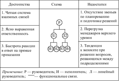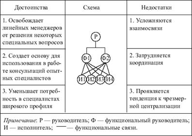 Линейные полномочия предоставляют руководителю узаконенную власть для управления подчиненными, принятие решений без со-гласования с другими руководителями в пределах своих должностных обязанностей, реализуется управление в линейной структуре через цепь команд по уровням управления. В линейной структуре разделение системы управления на составляющие части осуществляется по производственному признаку с учетом степени концентрации производства, технологических особенностей, широты номенклатуры продукции и других признаков. Линейная структура четко функционирует при решении задач с выполнением повторяющихся операций, но трудно приспосабливается к новым целям и задачам. Линейная структура управления широко используется мелкими и средними фирмами, осуществляющими несложное производство при отсутствии широких кооперационных связей между предприятиями. В современных условиях недостатки структуры перевешивают ее достоинства. Такая структура плохо совместима с современной философией качества. Область применения функциональной структуры – это однопродуктовые предприятия; предприятия, реализующие сложные и длительные инновационные проекты; средние узкоспециализированные предприятия; научно-исследовательские и проектно-конструкторские организации; крупные специализированные предприятия (рис. 7.2.).