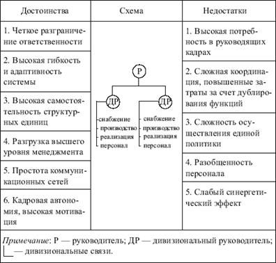 Структуризация организации по отделениям производится, как правило, по одному из критериев: по выпускаемой продукции, ориентации на потребителя, обслуживаемым регионам. Руководители вторичных функциональных служб отчитываются перед управляющим производственного подразделения. Помощники руководителя производственного отделения контролируют деятельность функциональных служб, координируя их деятельность по горизонтали (рис. 7.4.). Преимуществами дивизиональной структуры управления являются оперативное реагирование на изменение внешних условий, сближение стратегических и текущих задач, высокая степень координации в рамках одного дивизиона. Недостатками являются: внутренняя конкуренция за ресурсы и квалифицированный управленческий персонал, - различие в квалификации управленческого персонала в однотипных подразделениях разных дивизионов, - сложность разделения накладных расходов, - трудность согласования интересов власти и стратегических целей. При данной структуре возможно воплотить большую часть идей современной философии качества. Область применения дивизиональной структуры управления – это многопрофильные предприятия; предприятия с расположением в различных регионах; предприятия, осуществляющие сложные инновационные проекты.