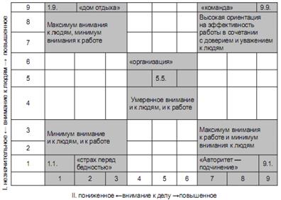 Основные варианты положения на «управленческой решетке». 1.1. «Страх перед бедностью». Данное положение на схеме характеризует руководителя, который уделяет мало внимания как своим сотрудникам, так и самой работе, т. е. такой руководитель пускает все дела на самотек и уделяет слишком мало внимания работе предприятия в целом. Он не стремится внести какие-то изменения в деятельность организации и полагается на обстоятельства. 1.9. «Дом отдыха». Положение, отражающее деятельность руководителя, который особое внимание уделяет потребностям и интересам подчиненных и мало заботится о производственном процессе. Такой процесс управления получил название «управление в духе загородного клуба». 9.1. «Авторитет – подчинение». Данный вид руководства характеризуется максимальным вниманием к производственной деятельности и минимальным к коллективу. Этот стиль называется еще бюрократическим. Он основывается на том, что люди – это винтики, а их потребности и проблемы никак не отражаются на выполнении ими служебных обязанностей, поэтому мотивировать их или поощрять, а уж тем более заботиться об условиях труда совершенно ни к чему. Такой менеджер пользуется принципом «результат – это все». Его подчиненные могут давать вполне неплохие результаты, но внутри коллектива будет расти недовольство существующей ситуацией, которое со временем может перерасти в открытое противостояние. 9.9. «Команда». Данное положение на «управленческой решетке» характерно для руководителя, который уделяет значительное внимание как самому производственному процессу, так и потребностям сотрудников. Затраты такого руководителя на ведение деятельности очень велики, а вот об отдаче и рентабельности деятельности речь стоит вести отдельно, так как издержки могут оказаться напрасными. 5.5. «Организация». Руководитель, которому отводится данное положение в «управленческой решетке», проявляет умеренный интерес как к своим подчиненным, так и к хозяйственной деятельности. Он с пониманием относится к проблемам сотрудников, но требует от них выполнения своих обязанностей, которые непременно соответствуют их возможностям. Способность такого руководителя является наиболее объективной по сравнению с вышеперечисленными. Такого руководителя можно считать идеальным типом, который, как и все идеальное, почти не встречается на практике. Недостатком данной теории является невозможность точного определения положения руководителя на данной решетке, так как информация, которую можно получить как от руководителя, так и от подчиненных, вряд ли будет полной и правдивой. Ситуационные теории лидерства имеют важное практическое значение, поскольку утверждают множественность оптимальных стилей лидерства в зависимости от ситуации. Они указывают на отсутствие единого универсального стиля управления и устанавливают эффективность руководства в зависимости от ситуационных факторов. Эффективным окажется лидер, который сумеет использовать возникшую ситуацию. Для этого необходимо хорошо знать способности подчиненных, их возможности для выполнения поставленной задачи, пределы своего влияния на исполнителей. В процессе выполнения задачи может измениться ситуация, и это потребует изменить способы воздействия на подчиненных, т.е. стиль руководства. Успешным окажется лидер, сп