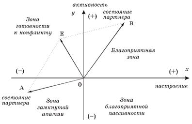 На рис. 15.2. показано, что действия обеих сторон негативными альтернативами (–/–) свидетельствуют о том, что с помощью «войн» понять друг друга нельзя. Позитивные действия с обеих сторон приводят к мирному исходу. Варианты альтернатив (–/+) или (+/–) могут привести к мирному варианту согласия, что определяется цепочкой причинно – следственных альтернатив в многоходовом взаимодействии. Графическая модель конфликта Состояние человека во взаимодействии можно интерпретировать графически в виде сочетания степени его активности и уровня настроения (рис. 15.3.). Измерение этих показателей можно производить от среднего, нейтрального (0) уровня. Тогда точка состояния определяется вектором с соответствующими координатами, например M (x1, y2). Состояние, определяемое другим вектором N (x1, y1), отличается меньшей активностью Dy = (y2 – y1). Состояние партнера, определяемое вектором A (x3, y2), отличается более скверным настроением, чем состояние партнера, определяемое вектором В (x2, y2).