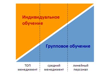 Рис. 17.1. Соотношение групповой и индивидуальной формы обучения для различных категорий персонала (общий тренд)