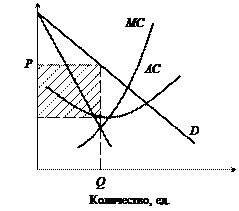 Рис. 10.4. Максимизация прибыли монополистически конкурентной фирмой Так как кривая спроса монополистически конкурирующей фирмы понижается и для увеличения сбыта она должна снижать цену, предельный доход от каждой проданной единицы товара оказывается меньше, чем от предыдущей единицы этого товара. На пересечении кривых МR и МС находится объем производства Q, максимизирующий прибыль. Так как соответствующая цена Р превышает средние издержки, фирма зарабатывает прибыль. На рис. 10.4 это показано заштрихованным прямоугольником.