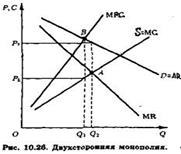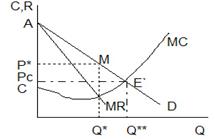 44. Другие формы несовершенной конкуренции: ценовая дискриминация, монопсония, двусторонняя монополия. Ценовая дискриминация первой степени (или совершенная ценовая дискриминация) имеет место, когда каждая единица товара продается фирмой по цене спроса, т.е. по максимально возможной цене, которую готов заплатить покупатель. Иногда такую политику называют ценовой дискриминацией по доходам покупателя. Если монополист не проводит ценовой дискриминации, т.е. устанавливает единую цену Р*, то как видно из рис. 5.12, при объеме выпуска от 0 до Q*(при котором выполняется равенство МС=MR) дополнительная прибыль от реализации каждой дополнительной единицы (предельная прибыль, Мп) равняется разнице между предельным доходом и предельными издержками Мп=MR — MC. Производство любого количества сверх оптимального сократило бы экономическую прибыль монополиста, которая может быть подсчитана как сумма прибылей от каждой реализованной единицы, что на рисунке соответствует заштрихованной площади АСЕ. Потребительский излишек, т.е. разница между суммой, которую покупатель готов был заплатить, и рыночной ценой Р*, изображен верхним треугольником АР*М. Если монополист проводит ценовую дискриминацию, то тогда все единицы товара продаются по их цене спроса, и следовательно, каждая дополнительно реализованная единица увеличивает совокупный доход на величину той цены, по которой она продается, т.е.