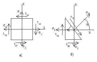 Нормальные напряжения имеют индекс, соответствующий оси их направления. Касательные напряжения, обычно, имеют два индекса: первый соответствует направлению нормали к площадке, второй — направлению самого напряжения (к сожалению, встречаются и другие обозначения, и другой выбор осей координат, что приводит к изменению знаков в некоторых формулах). Нормальное напряжение положительно, если оно растягивающее, касательное напряжение положительно, если оно стремится повернуть рассматриваемую часть элемента относительно внутренней точки по час.стр (для касательного напряжения в некоторых учебниках и вузах принято обратное). Напряжения на наклонной площадке: