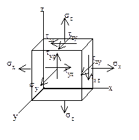 Различают три вида напряженного состояния: 1) линейное напряженное состояние — растяжение (сжатие) в одном направлении; 2) плоское напряженное состояние — растяжение (сжатие) по двум направлениям; 3) объемное напряженное состояние — растяжение (сжатие) по трем взаимно перпендикулярным направлениям. Рассматривают бесконечно малый параллелепипед (кубик). На его гранях могут быть нормальные s и касательные t напряжения. При изменении положения " кубика" напряжения меняются. Можно найти такое положение, при котором нет касательных напряжений см. рис.