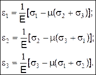 sx+sy+sz=s1+s2+s3 — сумма нормальных напряжений, действующих по любым трем взаимно перпендикулярным площадкам есть постоянная величина, равная сумме главных напряжений (первый инвариант). Деформации при объемном напряженном состоянии. Обобщенный закон Гука (закон Гука при объемном напряжении):