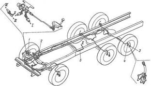 Система (рис. 1) состоит из питающего контура пневмосистемы автомобиля, крана управления давлением 1 с клапаном-ограничителем, шинных кранов 3, блока сальников подвода воздуха в цапфе 4, трубопроводов и воздушного баллона.
