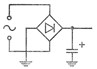 | Однофазная мостовая выпрямительная схема (упрощенное изображение) Примечание. К выводам 1-2 подключается напряжение переменного тока; выводы 3-4 - выпрямленное напряжение; вывод 3 имеет положительную полярность (цифры 1, 2, 3, 4 указаны для пояснения)